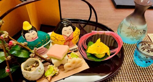 3月の前菜七種、日本酒(雁木大吟醸)