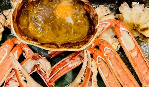 焼物(焼き蟹)肉料理NGの母娘のために用意され、弟は神戸牛ステーキ