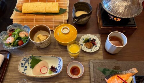 翌朝の朝食膳。ご飯、味噌汁、湯豆腐、豪華なデザートもつきました