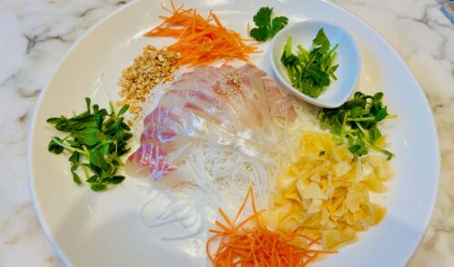 前菜の鯛サラダは、目の前で味付けして、カルパッチョ風に